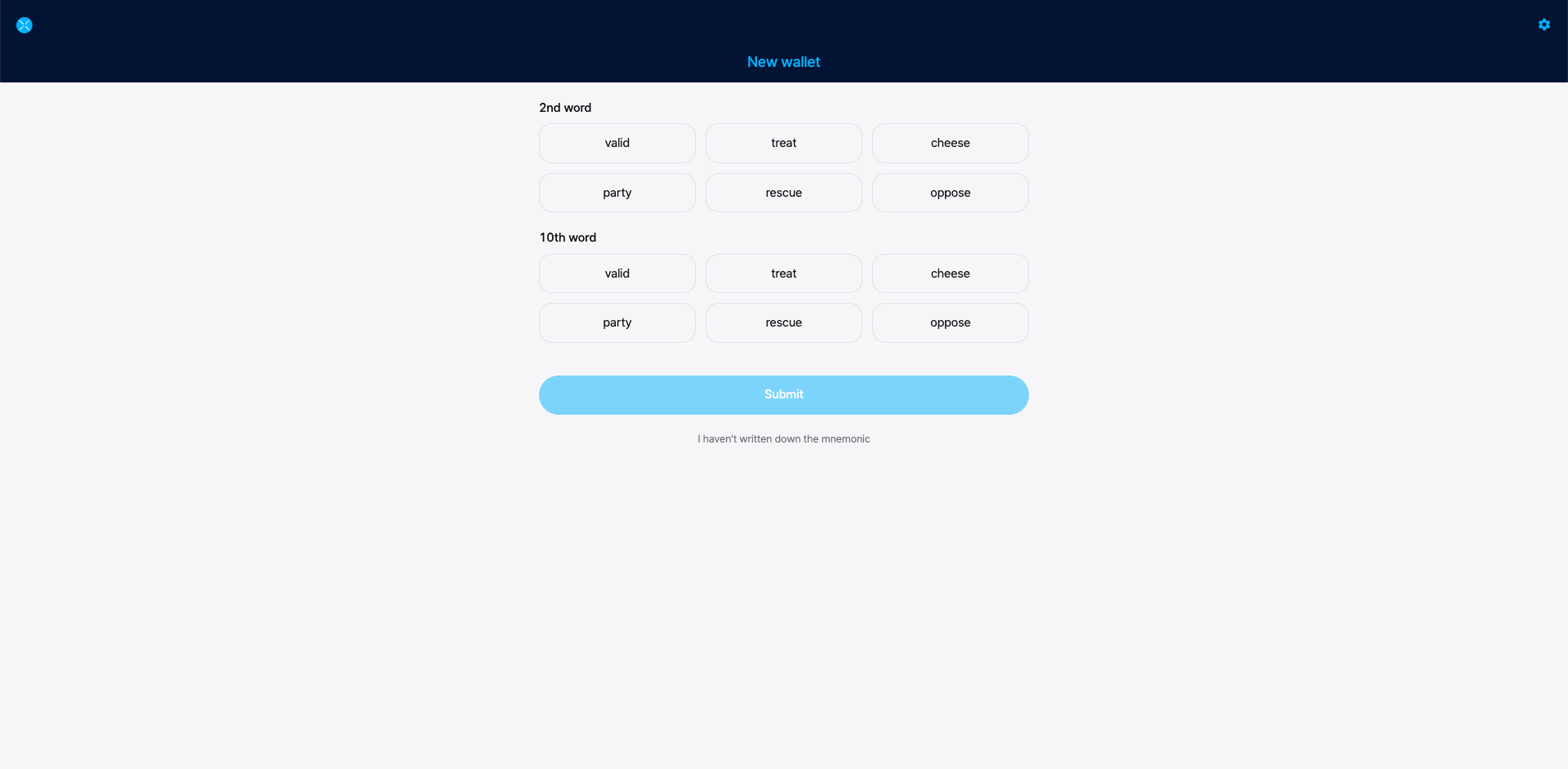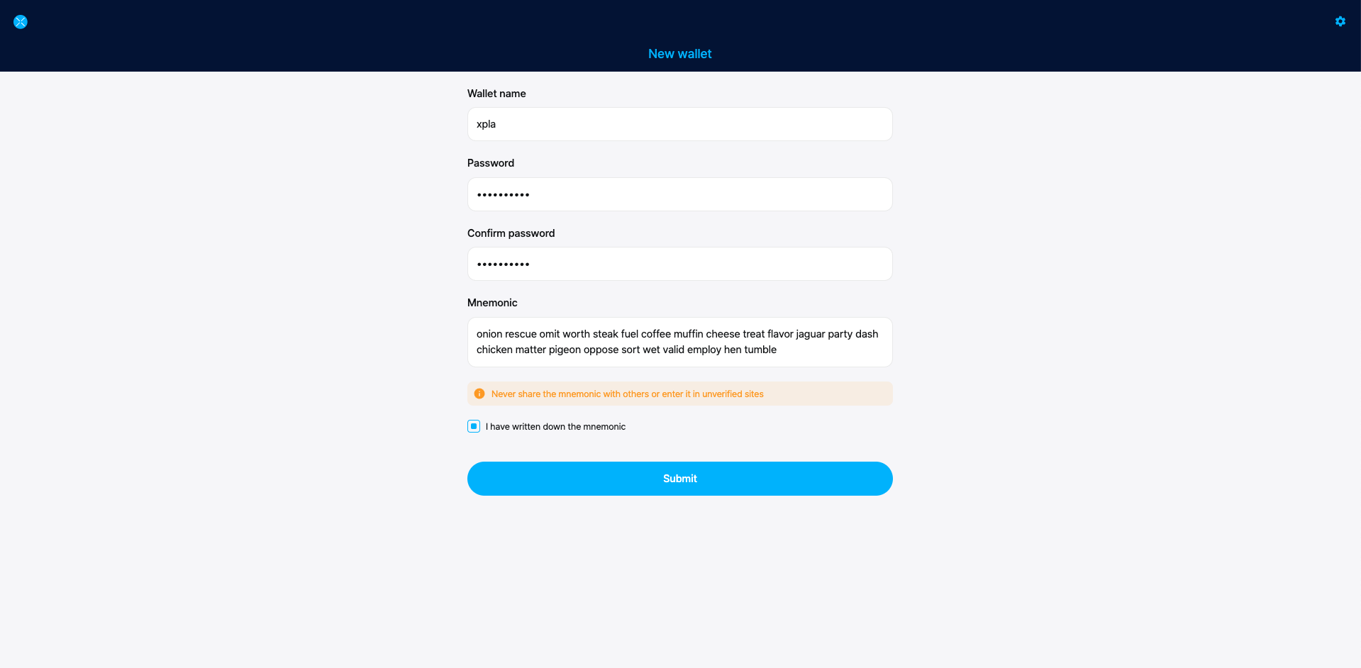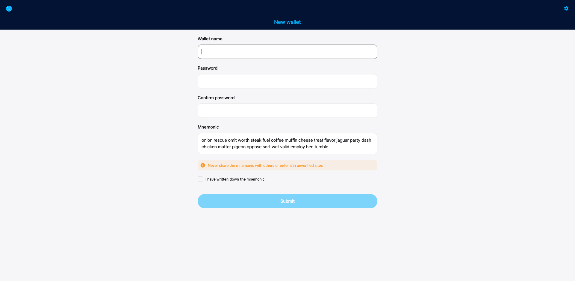 Check the box ensuring you wrote down your mnemonic, and click Submit.